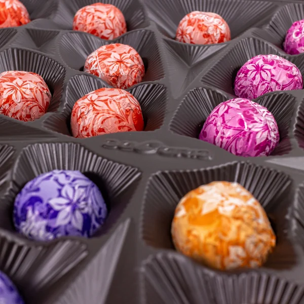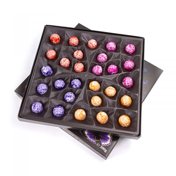 Bomboane de ciocolată asortate cu piure de fructe ( caisă, căpsună, visină, coacăză )